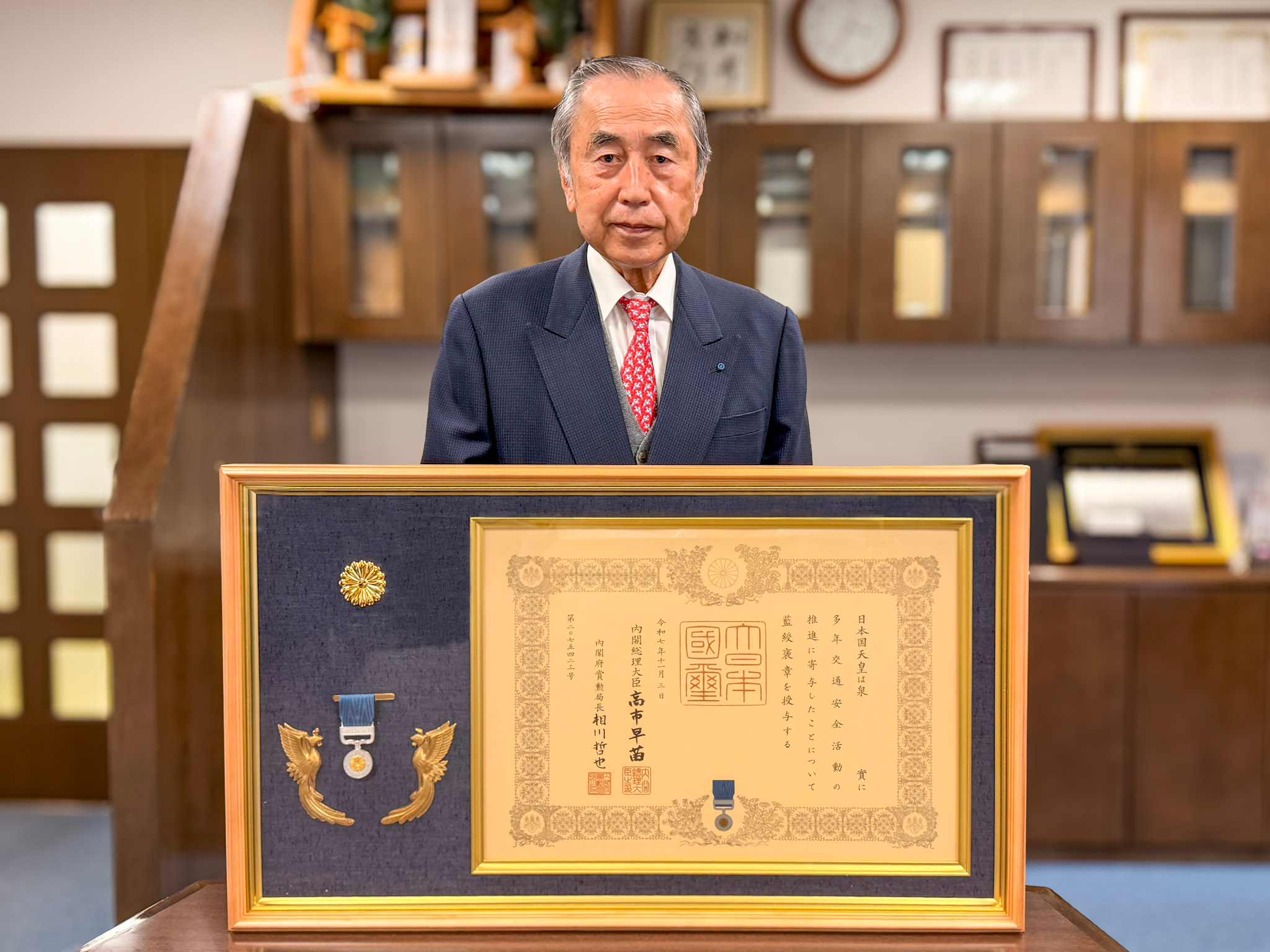 このたび、弊社代表取締役会長 泉 實 が、地域の交通安全活動に対する長年の貢献が認められ、令和7年秋の褒章において藍綬褒章を受章いたしました。